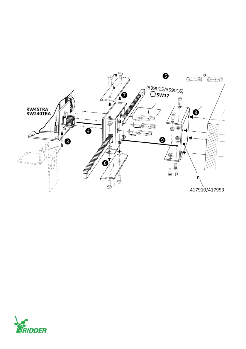 ❾ Install the TRA drive-unit to the wall mounng plate (n) with four M10 bolts (p) and lock nuts.