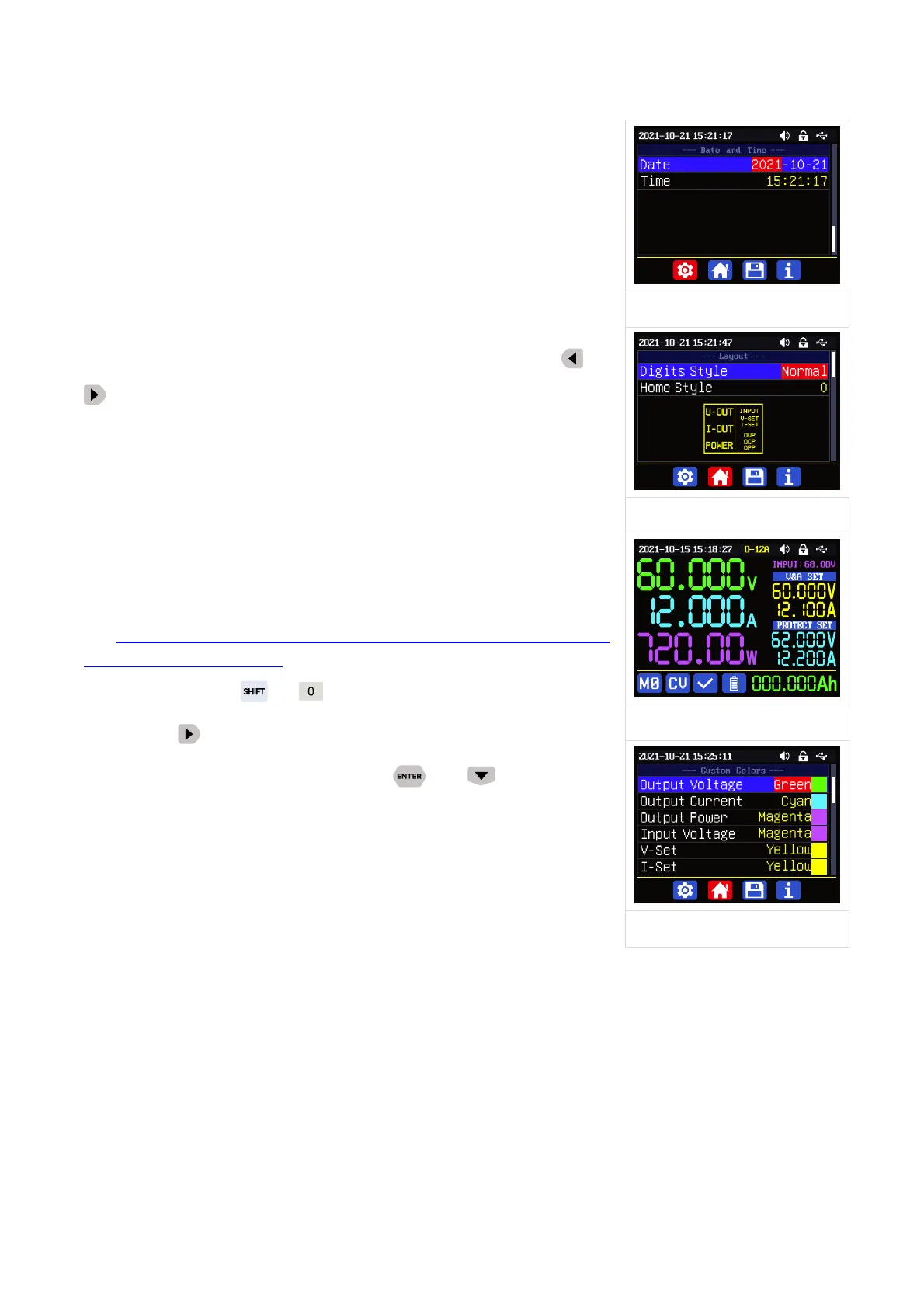 You can set the the display colors for output voltage, output current, output power.....as shown