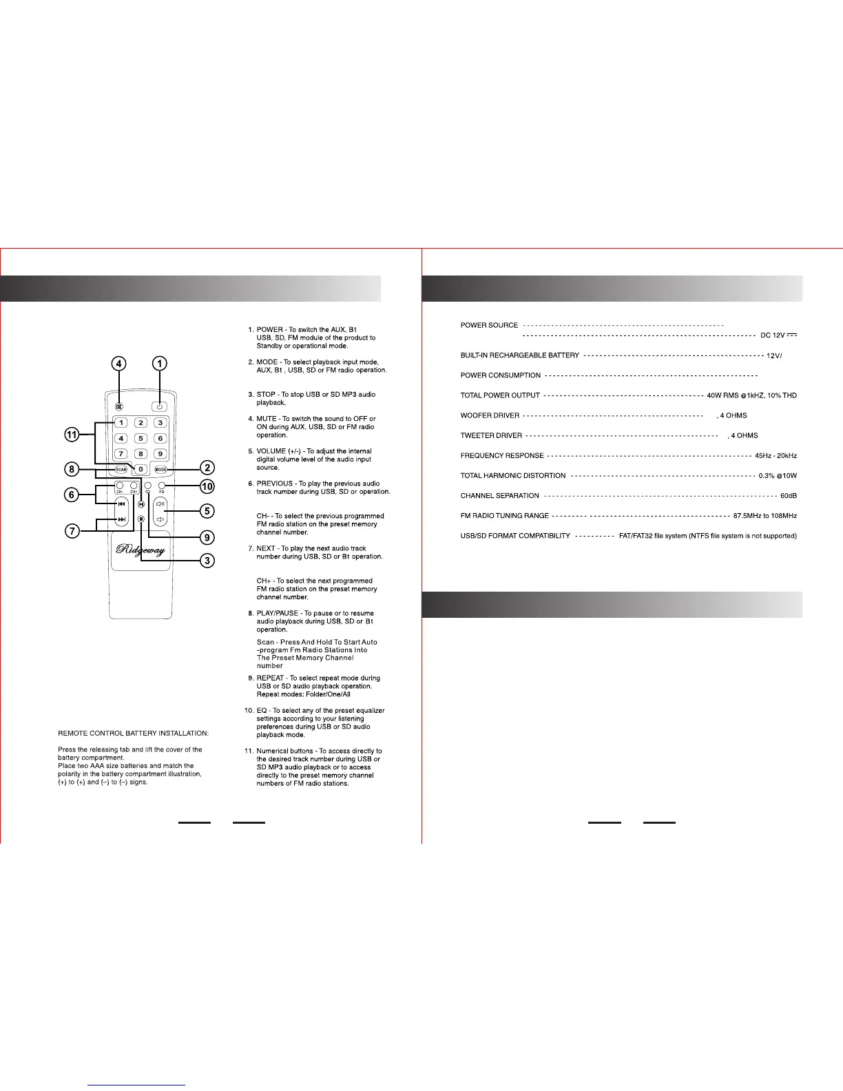 Ridgeway QS-3315BR - Remote Control Functions; POWER; MODE; STOP
