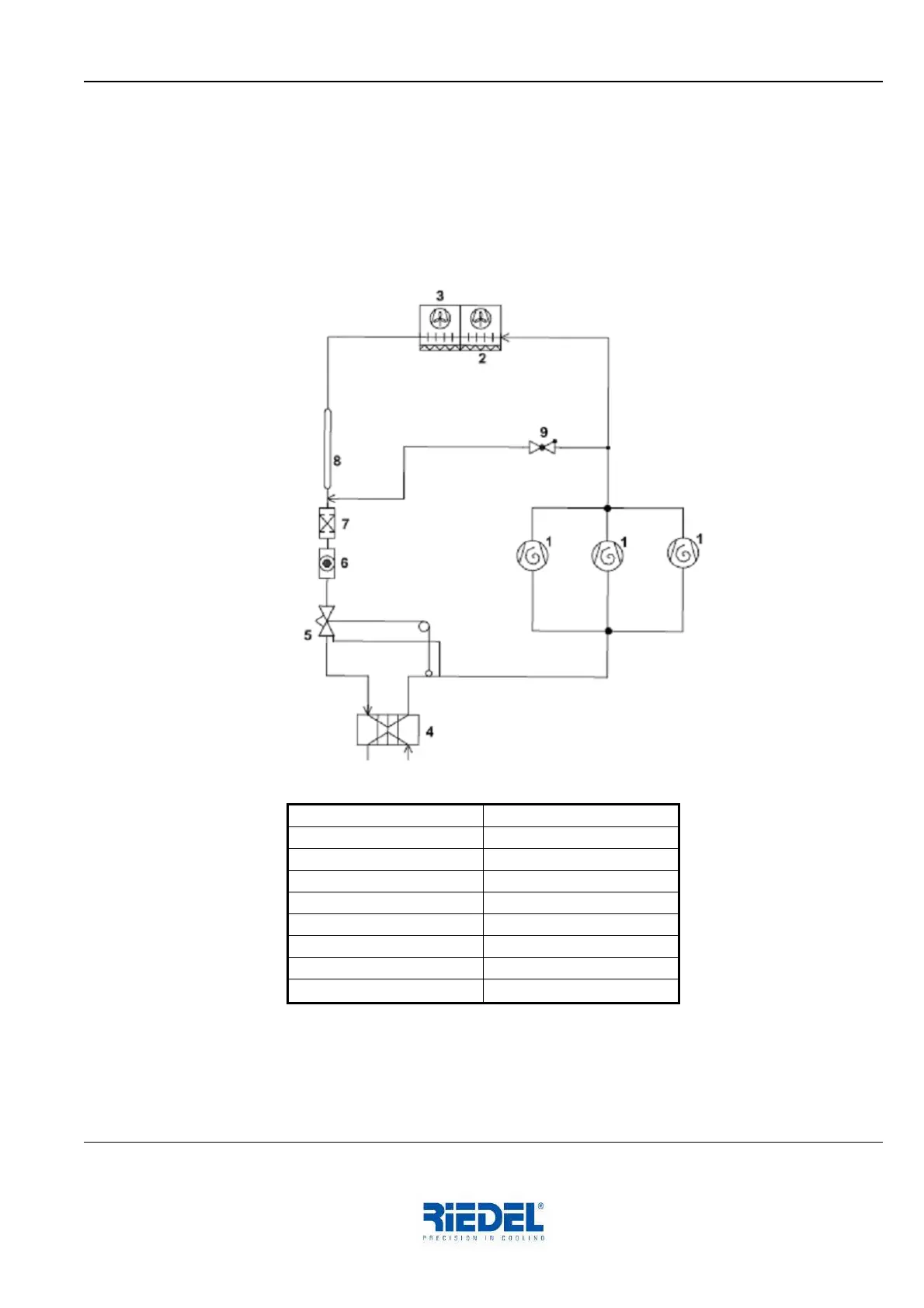 receiver (pipe expansion), the filter drier (7) and the sight glass (6). The expansion valve permits