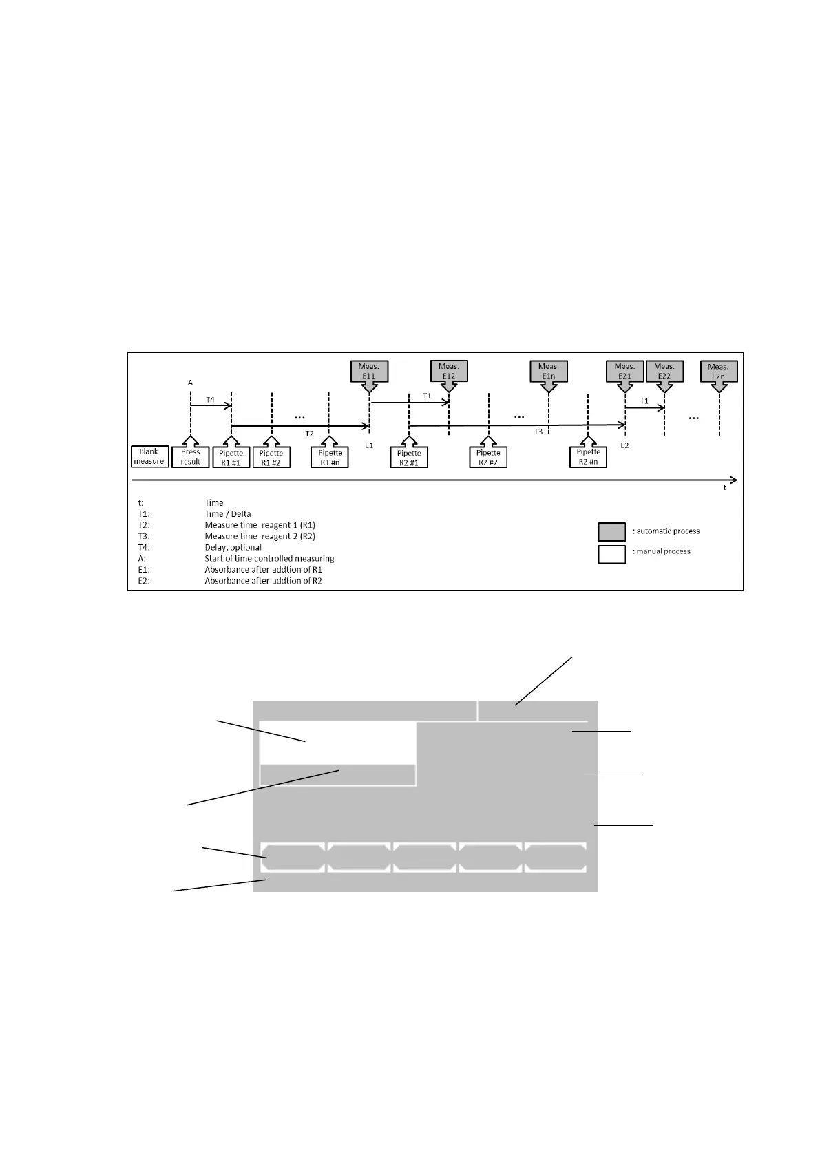 before a second reagent (R2) is added. E2 is the absorbance after adding R2. The course of the procedure is