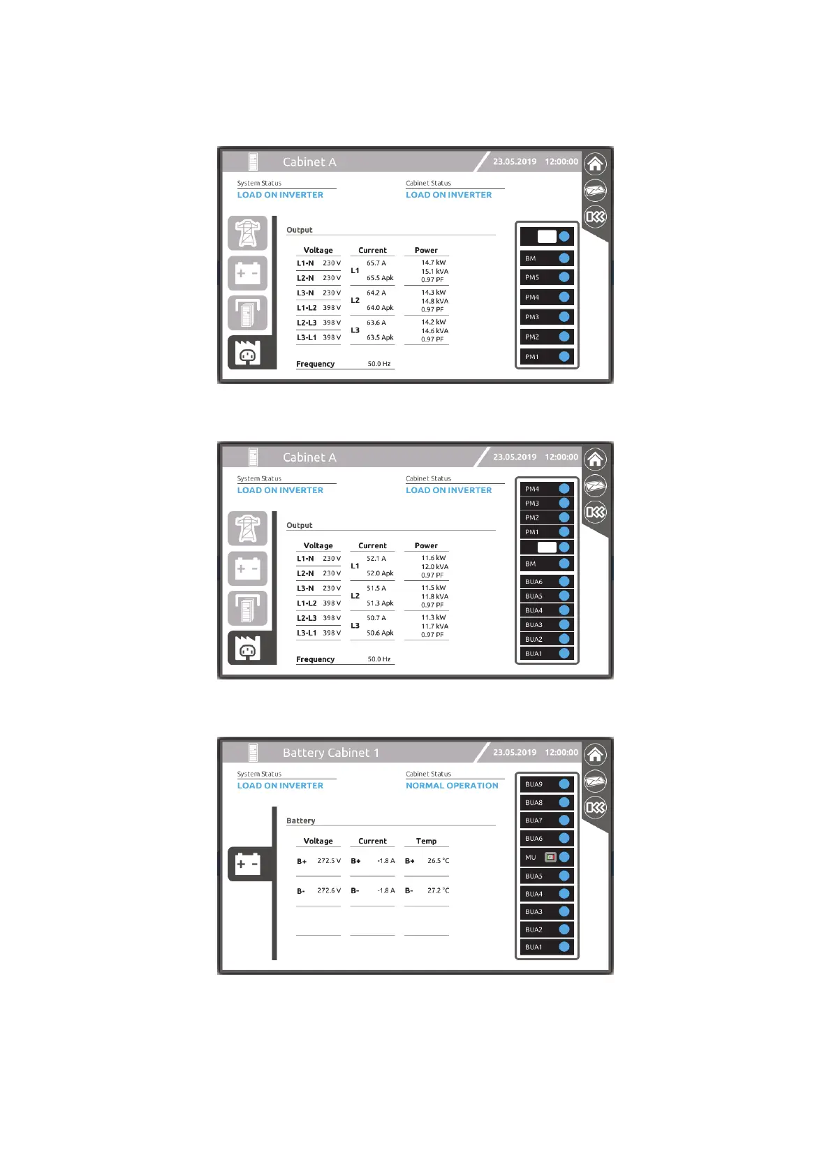 The "Cabinet" page displays the status of all of the modules and of the main electrical values of the cabinet indicated on the status