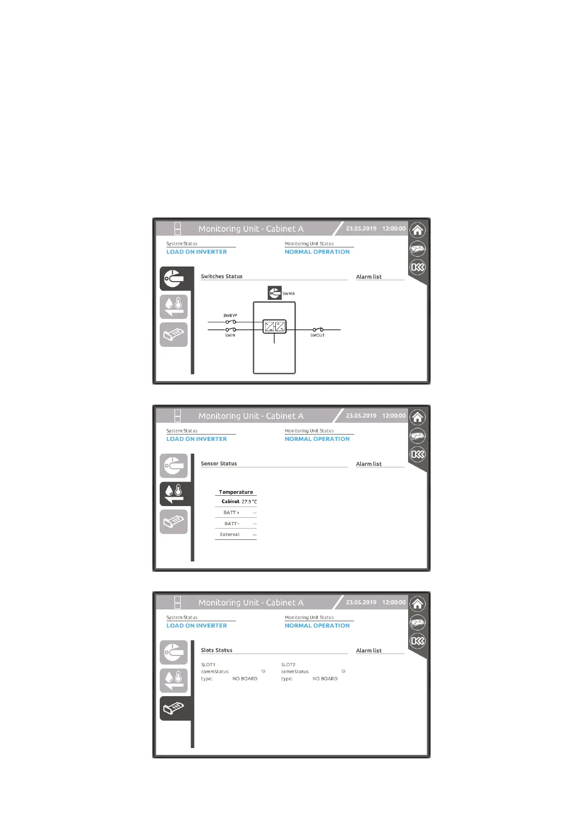 The Switches Status, the Sensor Status and the Battery Status (only for Combo Cabinet MPX 100 CBC or Battery Cabinet MPW