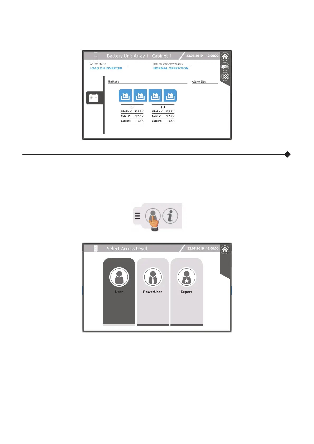 This page displays the electrical values and any anomalous situations within the selected Battery Unit Array (BUA).