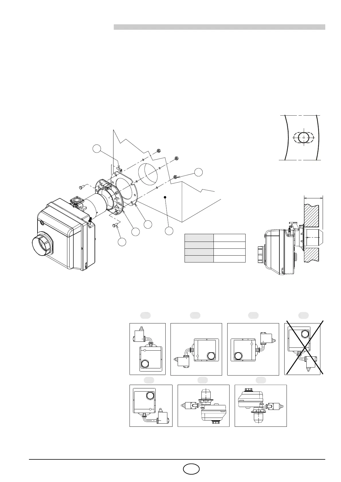 Put on the flange (5) the burner combustion head, tighten the flange with the screws (6) and lock the