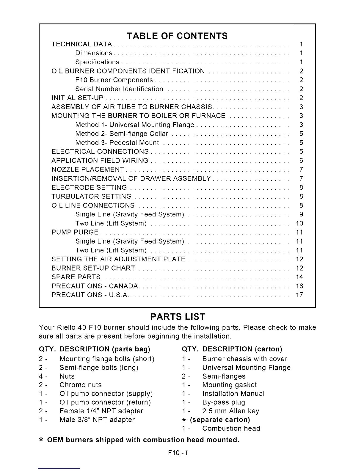 Your Riello 40 F10 burner should include the following parts. Please check to make