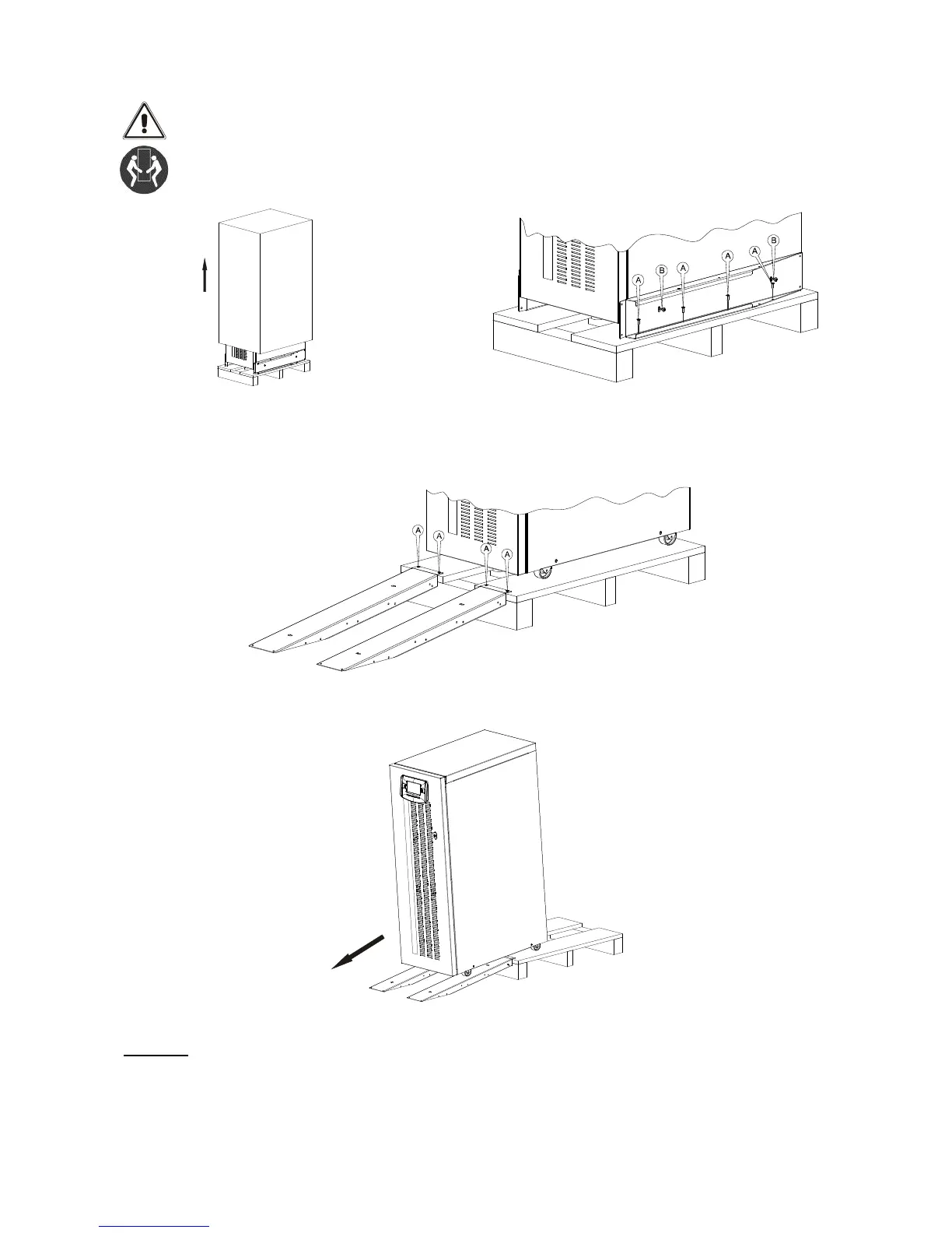 WARNING: to unload the UPS from the pallet, we recommend that you push it down the ramps from behind, taking