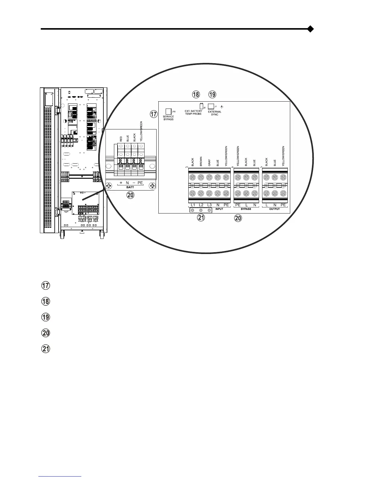 Power connections: BATTERY, INPUT, SEPARATE BYPASS (optional), OUTPUT