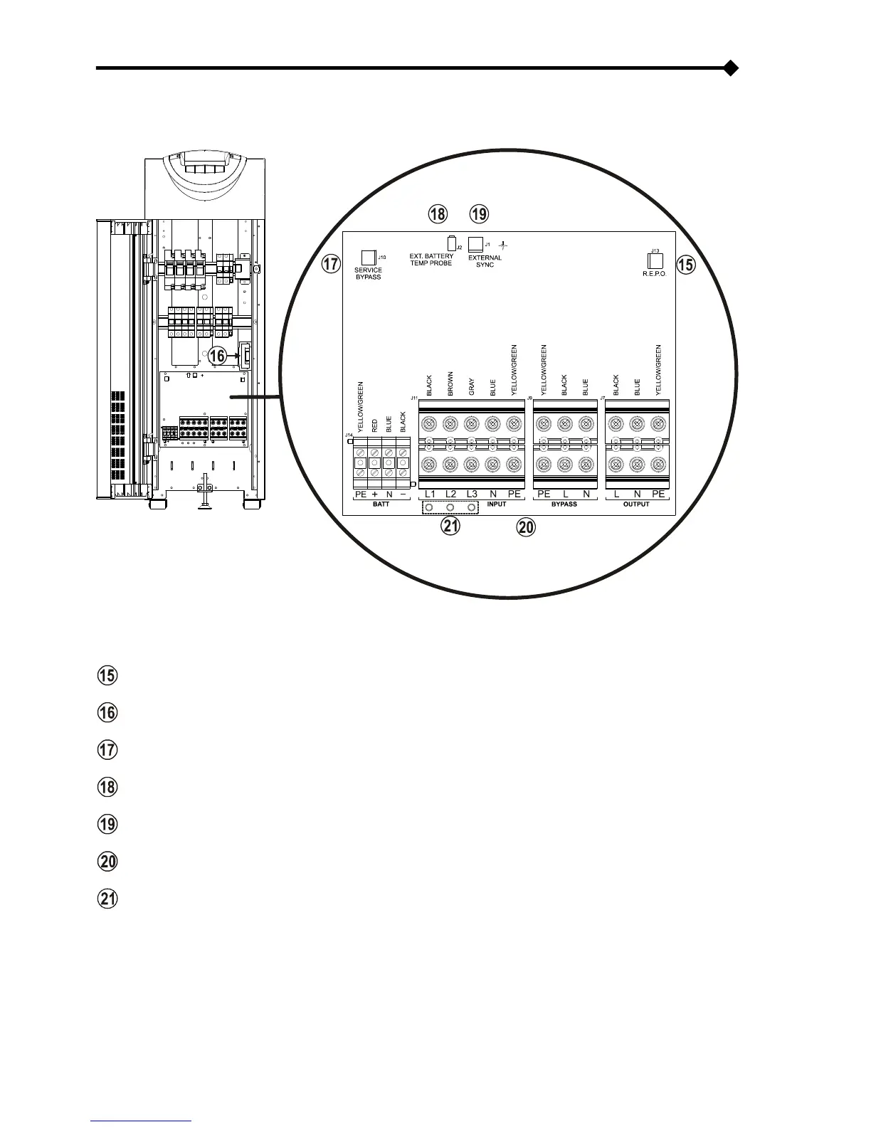 Power connections: BATTERY, INPUT, SEPARATE BYPASS (optional), OUTPUT