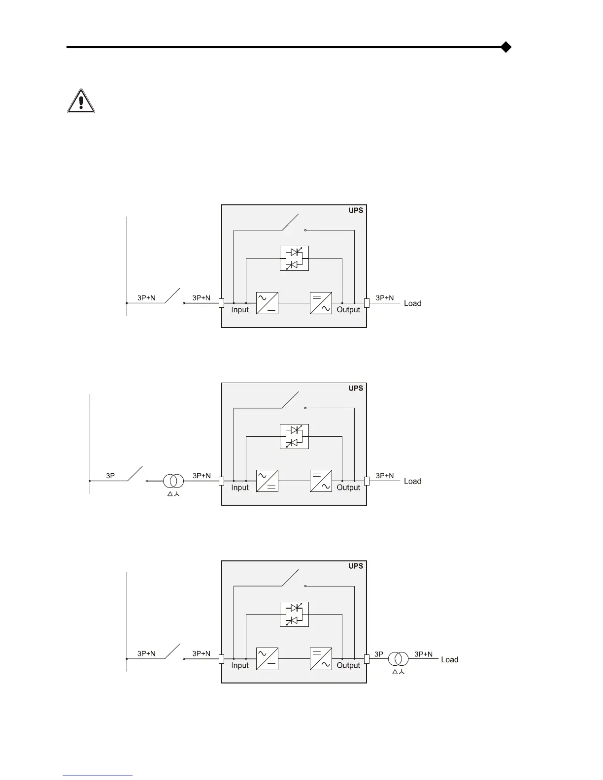 The UPS must be connected to a power supply line made up of 3 phases + neutral + PE (protective earth) of TT, TN