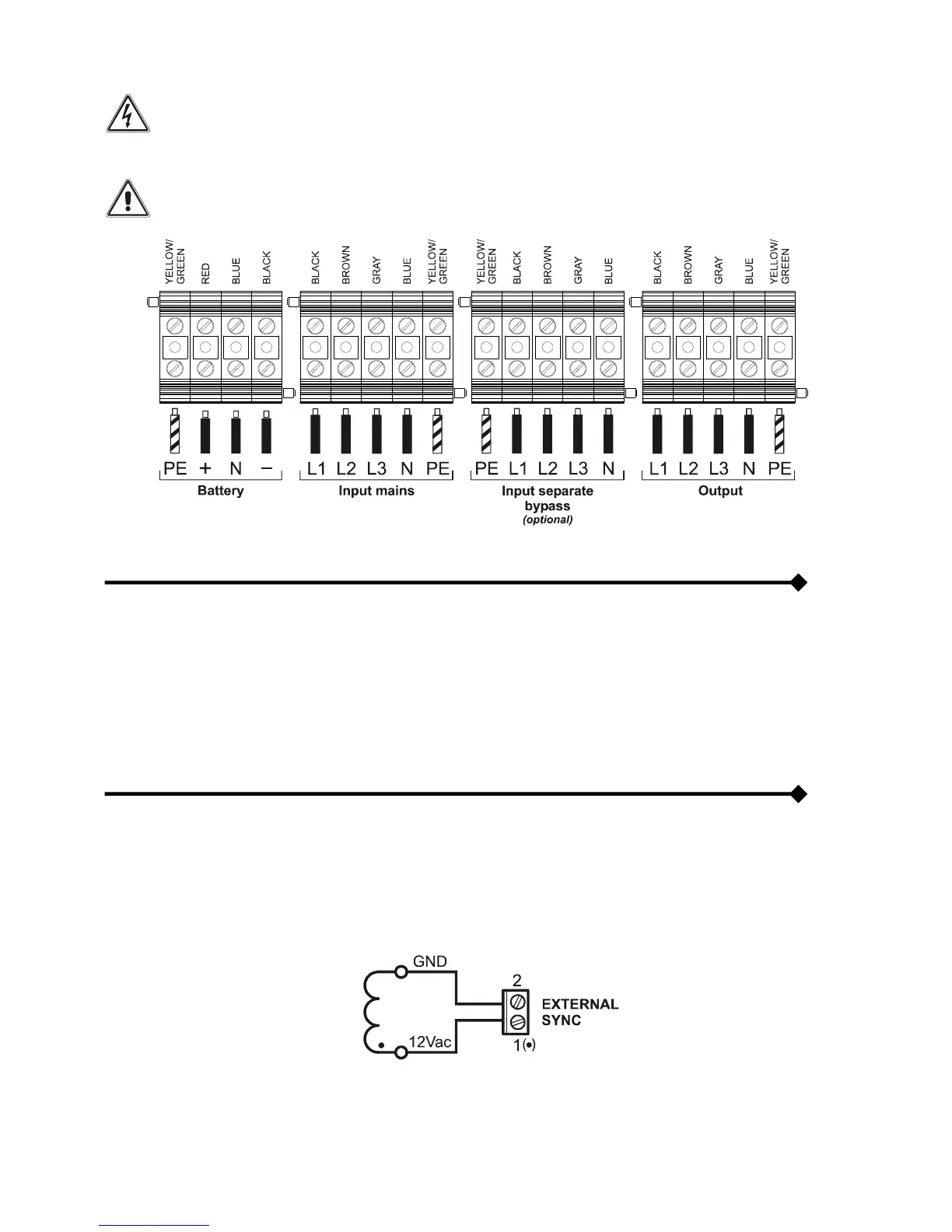 connect the transformer secondary to the "EXTERNAL SYNC" terminal (see "View of UPS connections” ref.19) using a