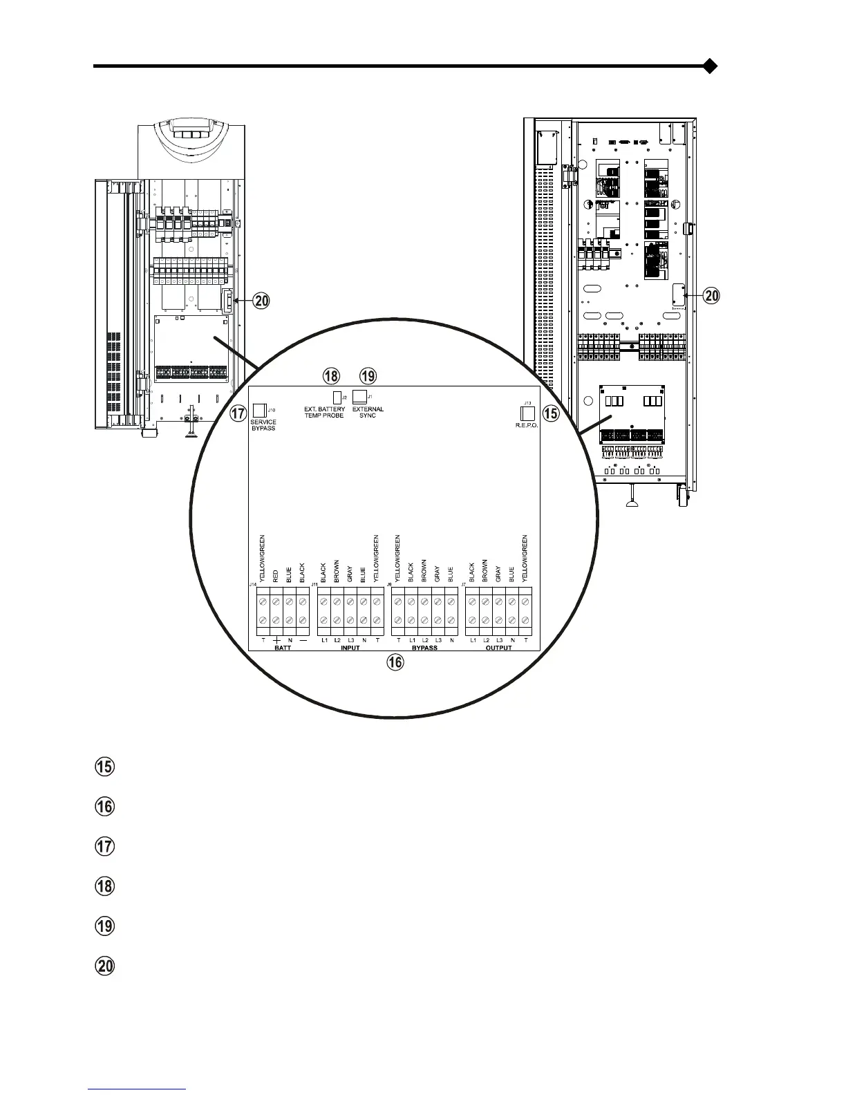 Riello MCT 20 - VIEW OF THE UPS CONNECTIONS; Connection for the R.E.P.O command (Remote Emergency Power Off); Power connections: BATTERY, INPUT, SEPARATE BYPASS (optional), OUTPUT; Connection for remote maintenance bypass command