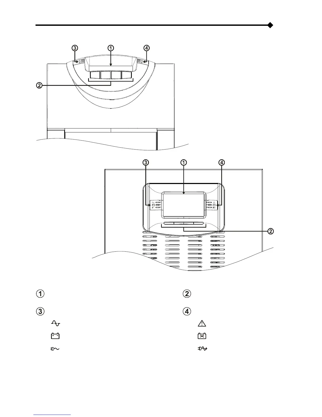 Riello MCT 20 - VIEW OF THE CONTROL PANEL; Graphic display; Function keys; Left-hand LEDs area: Mains power LED, Battery power LED, Load on bypass LED