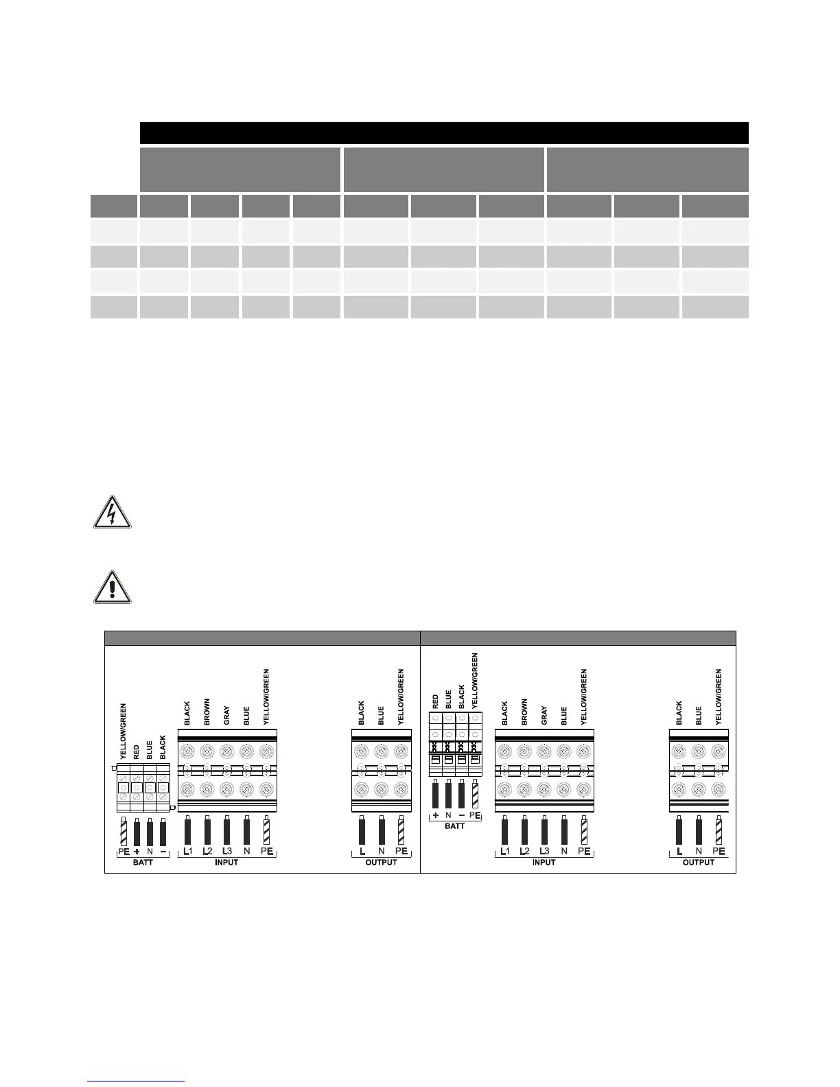 Please refer to the following table for the minimum cross-sections to be used for the input and output cables.