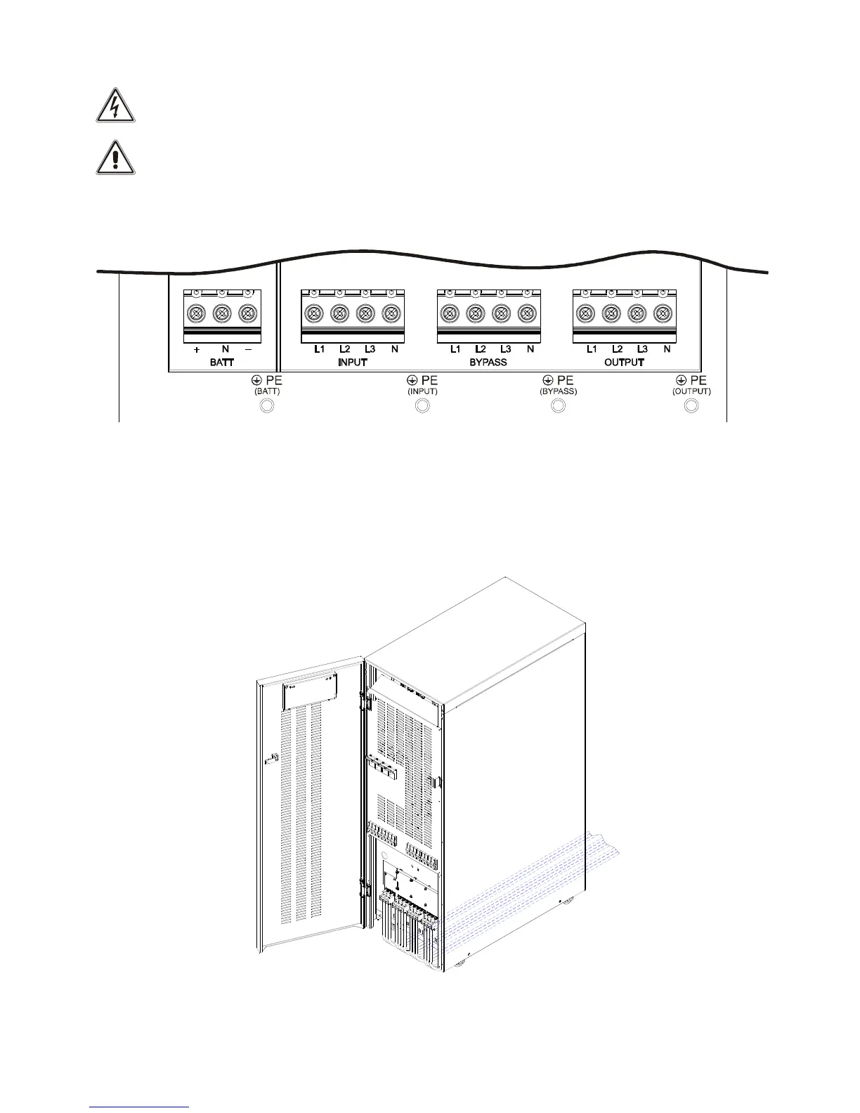 be connected to the terminal marked PE. The UPS must not operate without being connected to an