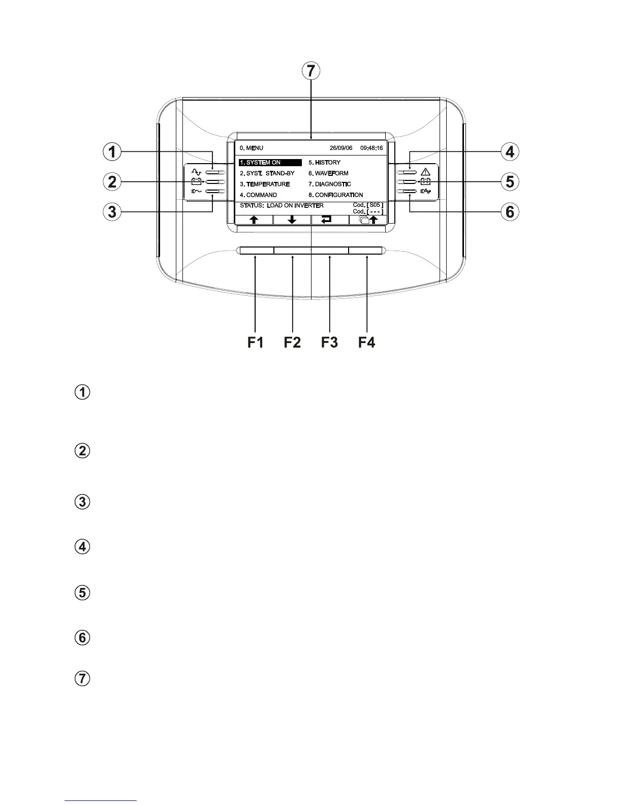 F1, F2, F3, F4 = FUNCTION KEYS. Each key's task can be found on the lower part of the display and varies according