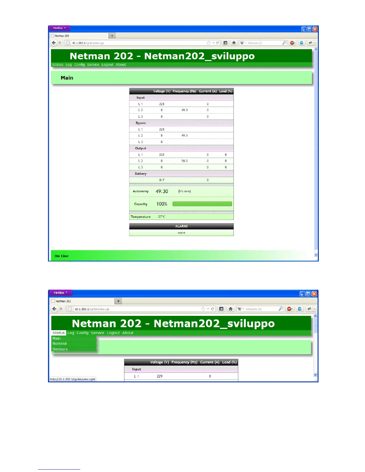 Besides the “Main” view, is possible to switch the view from the “Status” menu which includes also