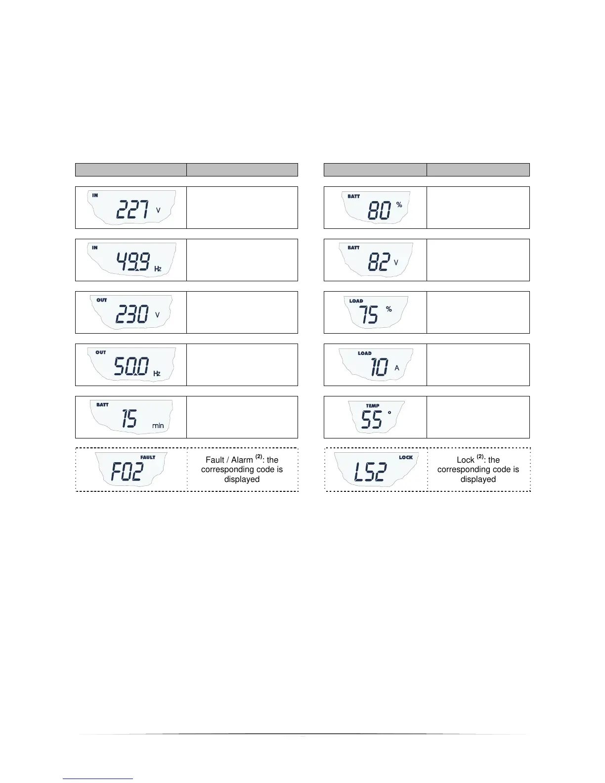 In the event of a fault/alarm (FAULT) or a lock (LOCK), the display will automatically show the type and code of the