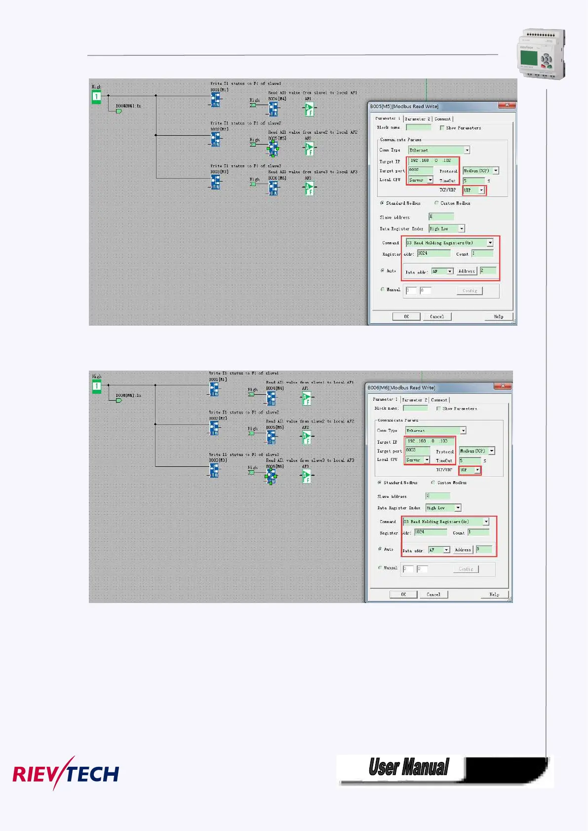 B005 is used to read the AI1 value from slave2, then save it into AF2 of master(slave1 IP 192.168.0.102,