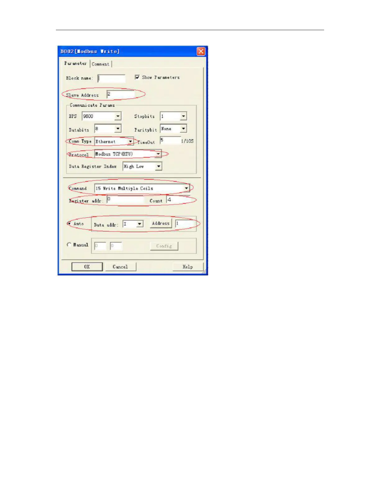 B005: Read the I1--I4 status from the slave1 to the F11-F14 of the master. Setting as follows: