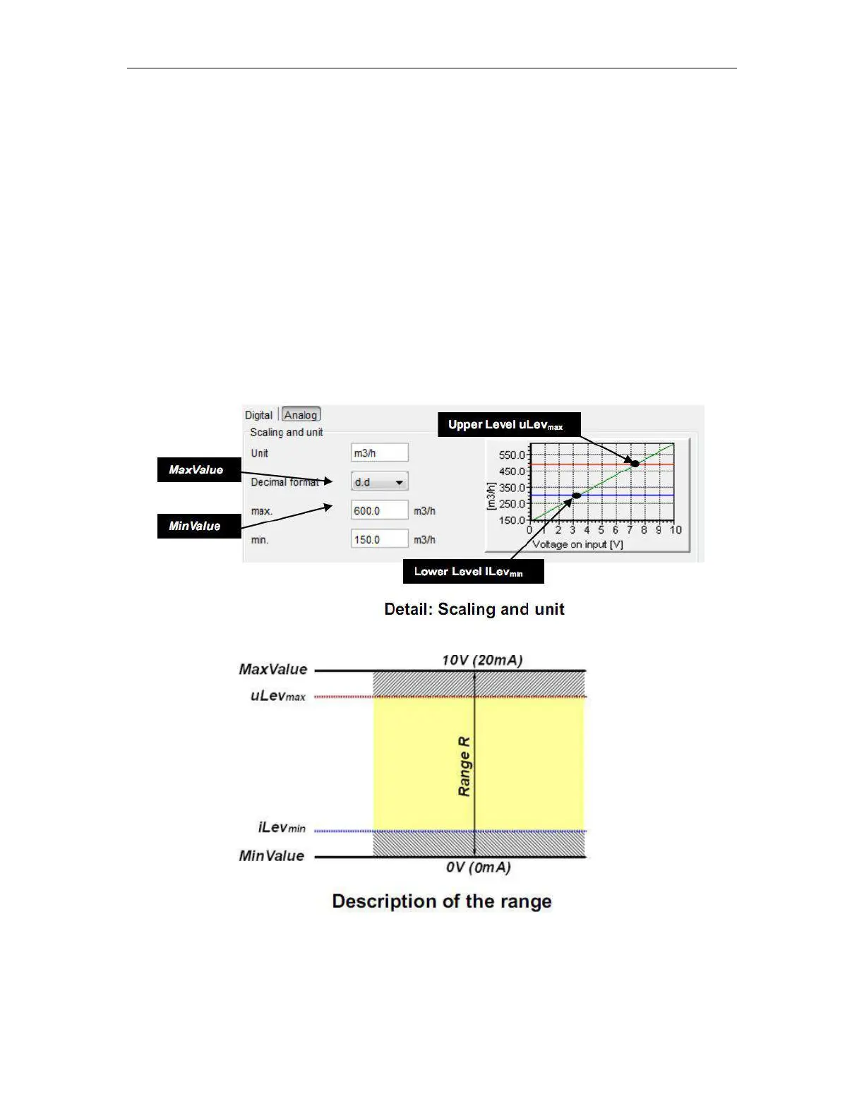 (20 mA), a minimal and a maximum value of the selected unit is assigned. With this two values, a linear