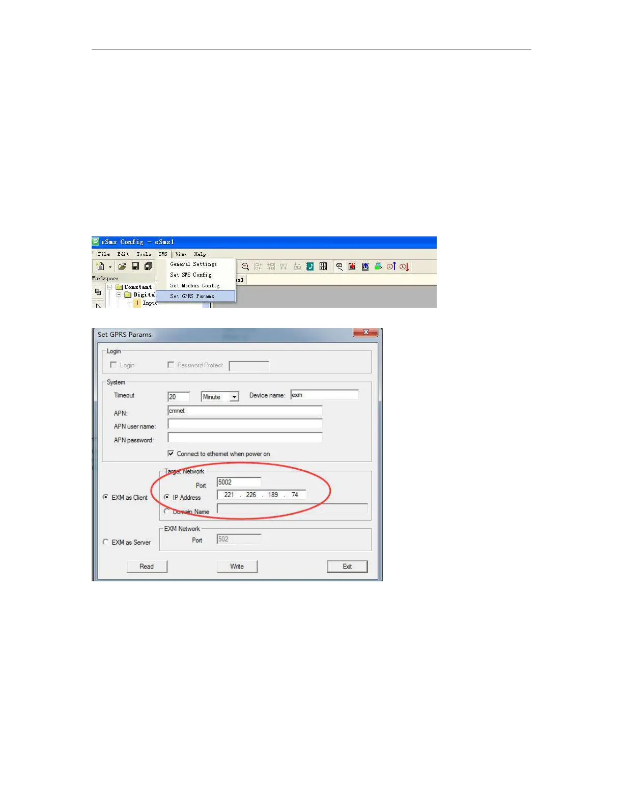 Click the menu “SMS->Set GPRS params” to set the server port number.