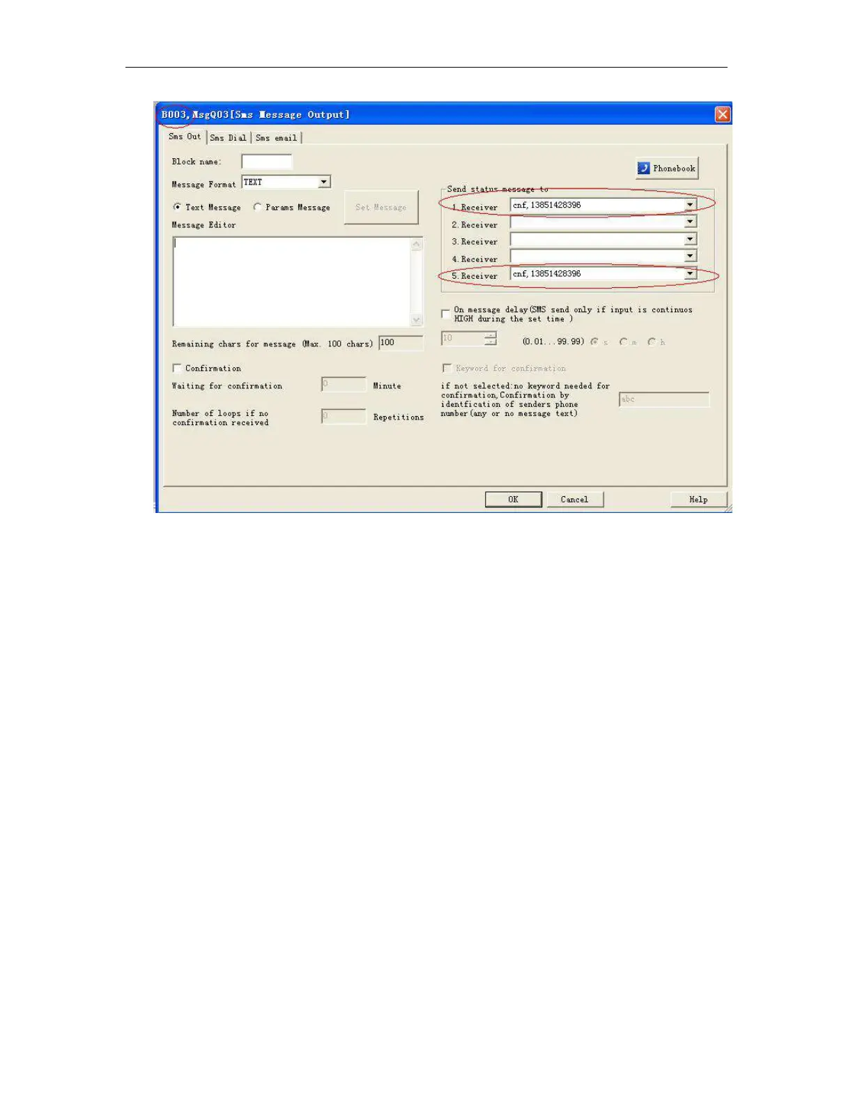 This is to change receiver 1 for all the sms message output block in the program.