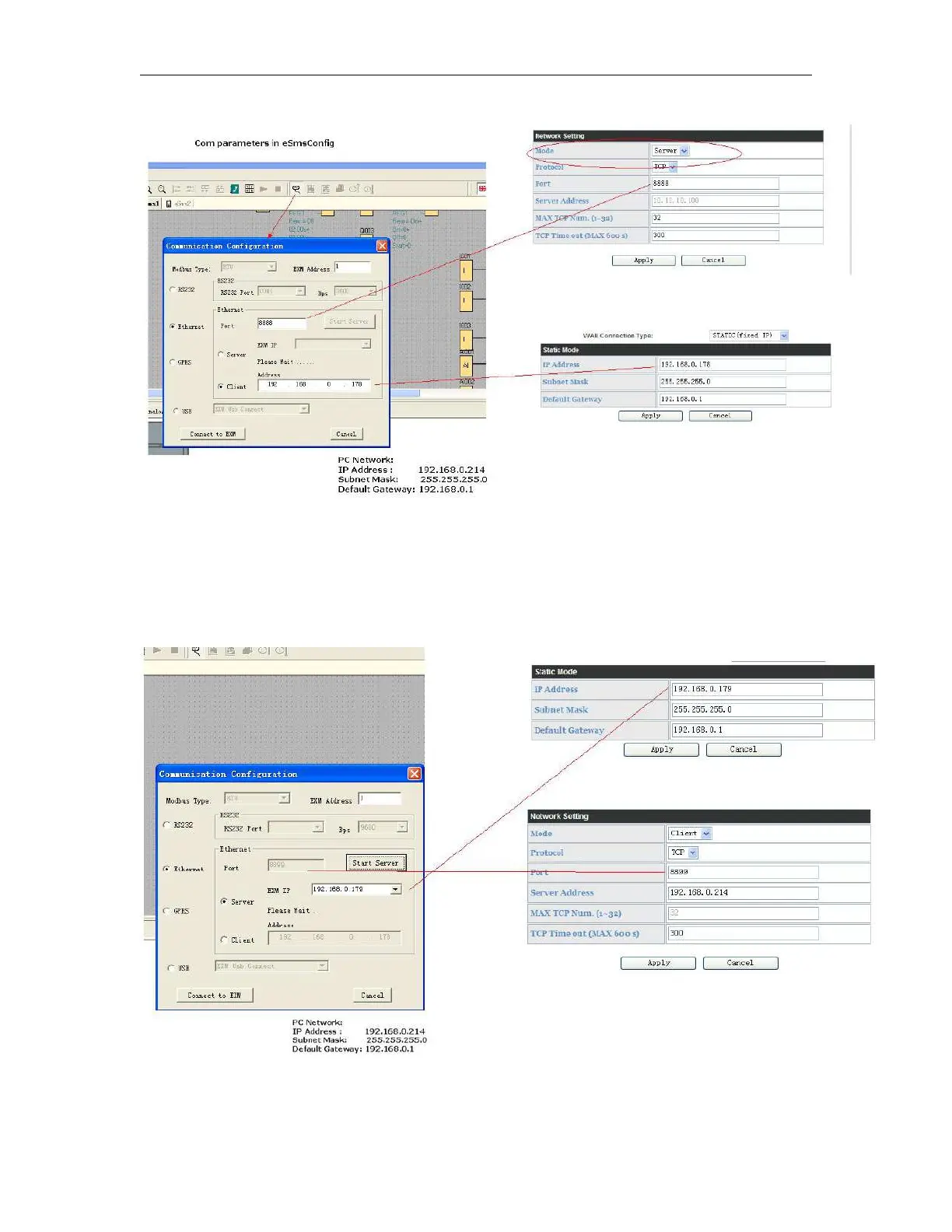 B. EXM WIFI unit works as client, eSmsConfig works as server.