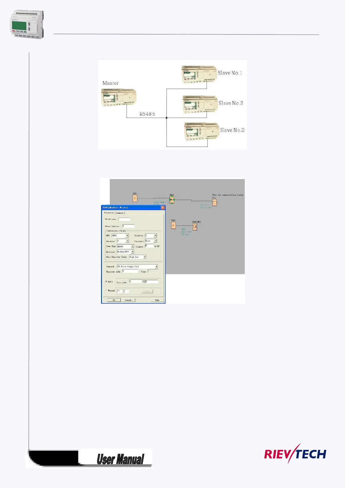 Write the I2 bit status of Master xLogic to Slave xLogic with No.1 and control Q1 of Slave via RS485 port.