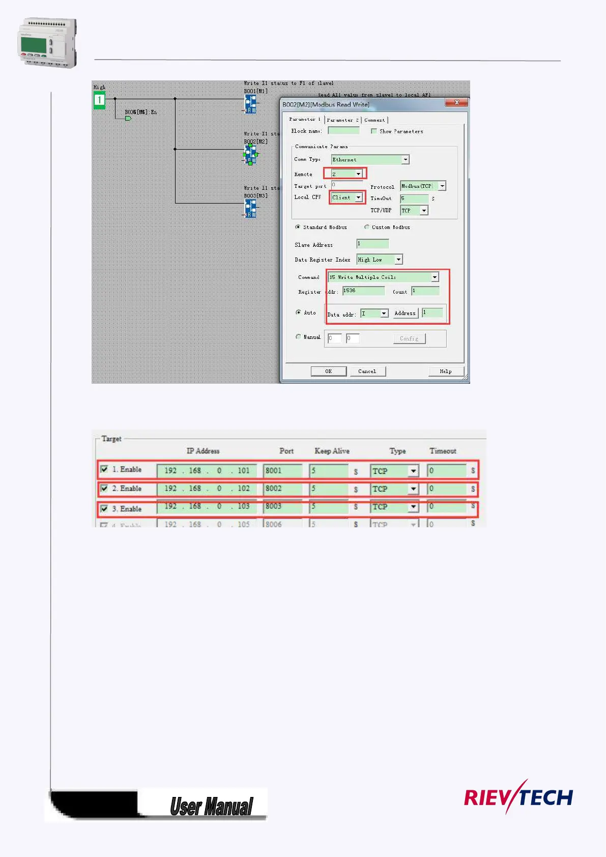 B002 is used to write I1 status to F1 of slave1, the Remote 2 is the target2 in the network parameter