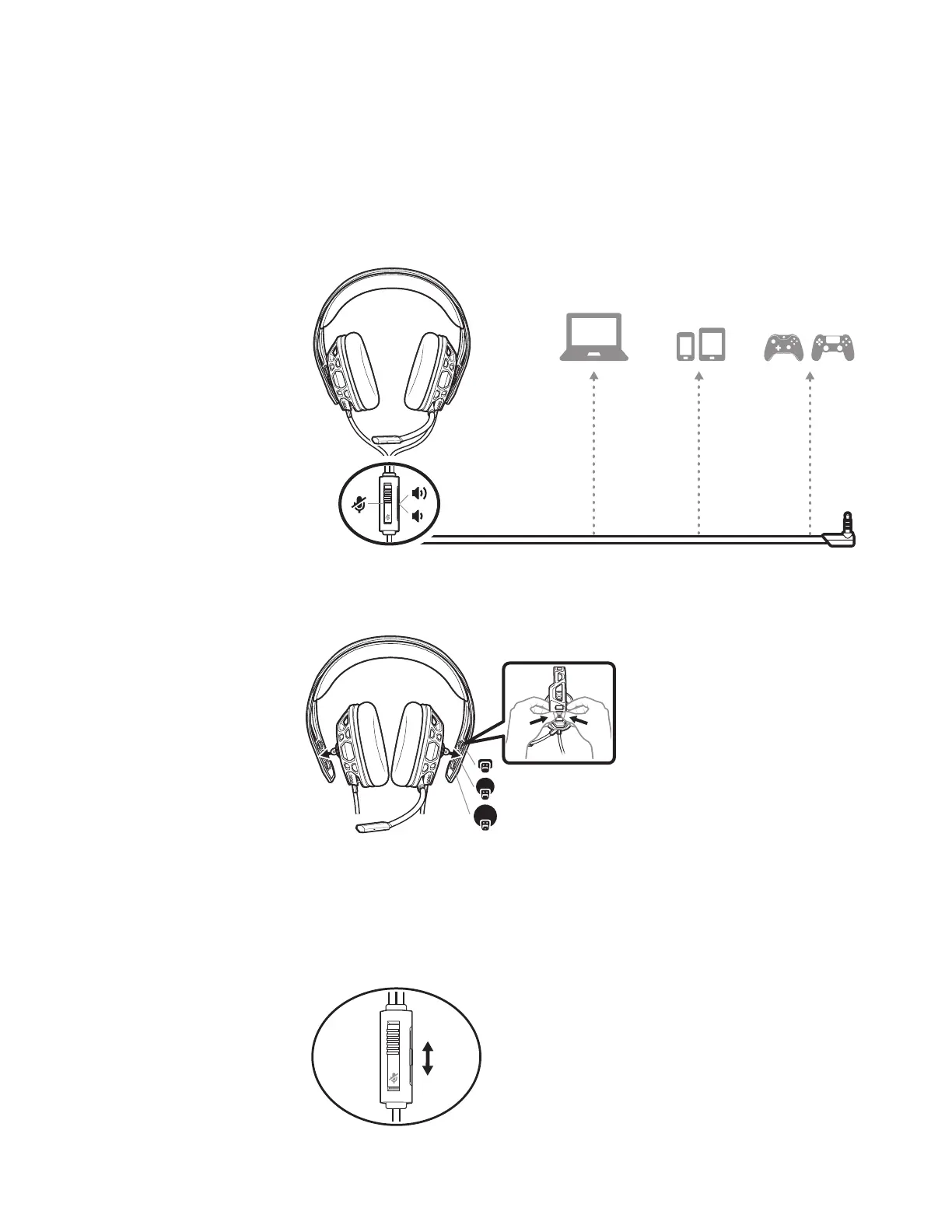 The headband adjusts to three sizes (small, medium, large) by moving the earcups. To remove an