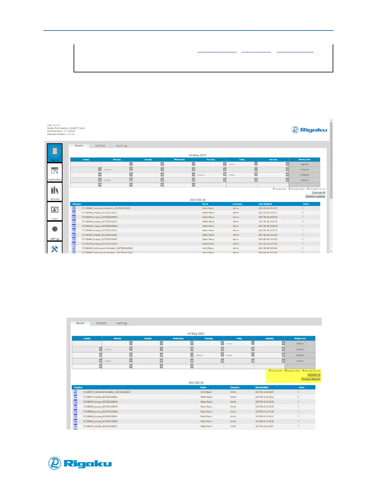 4. Click on a date from the calendar view or an individual Results filename to open it as a PDF form