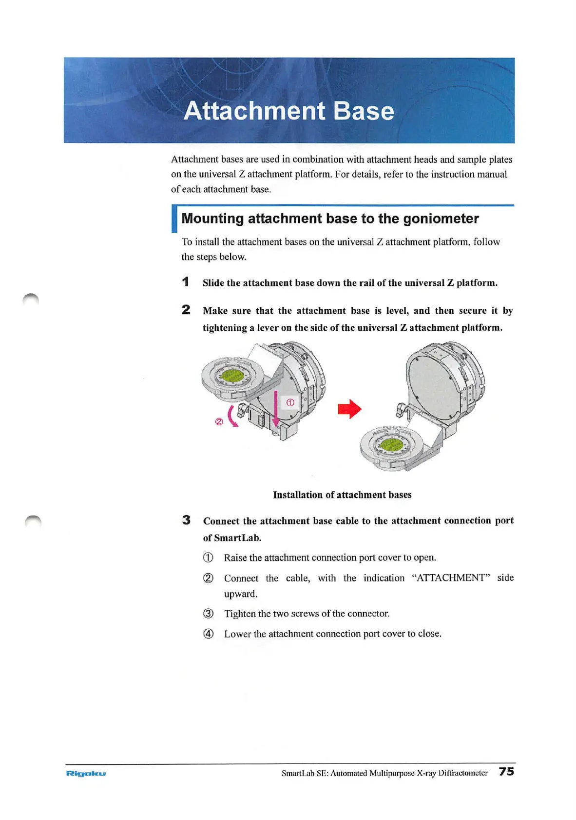 Attachment bases are used in combination with attachment heads and sample plates