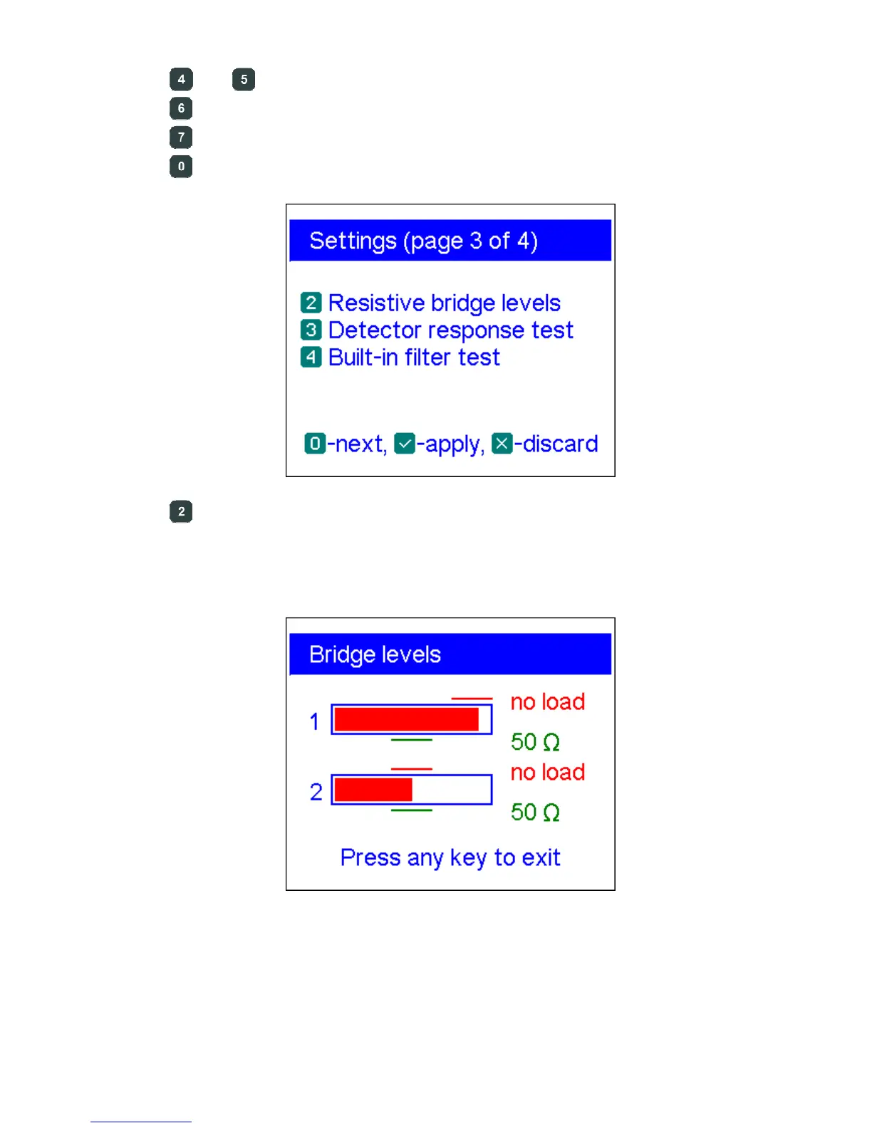 – RF bridge test. Two filled bars display signal levels at the left and at the