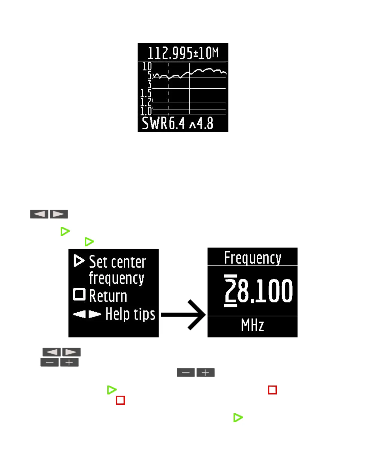 at the bottom of the screen: the SWR value under the marker (solid vertical line) and the minimum of the SWR