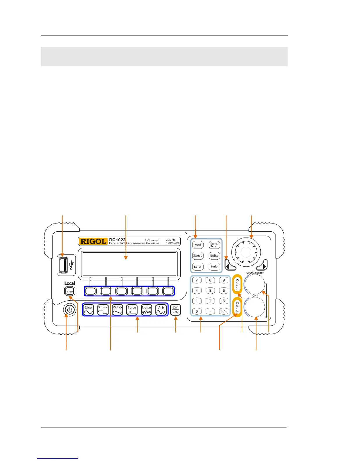 DG1022 Generator has clear and simple front panel. The Front Panel has a knob,