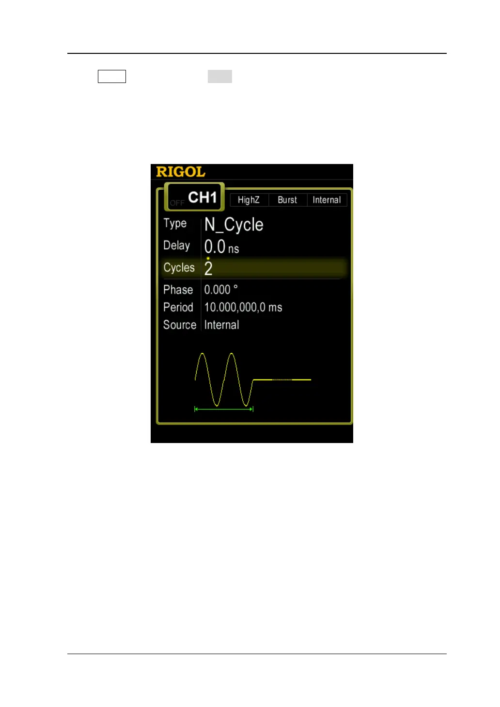 When Burst is enabled, press Type to select "N Cycle". The parameter "Cycles"