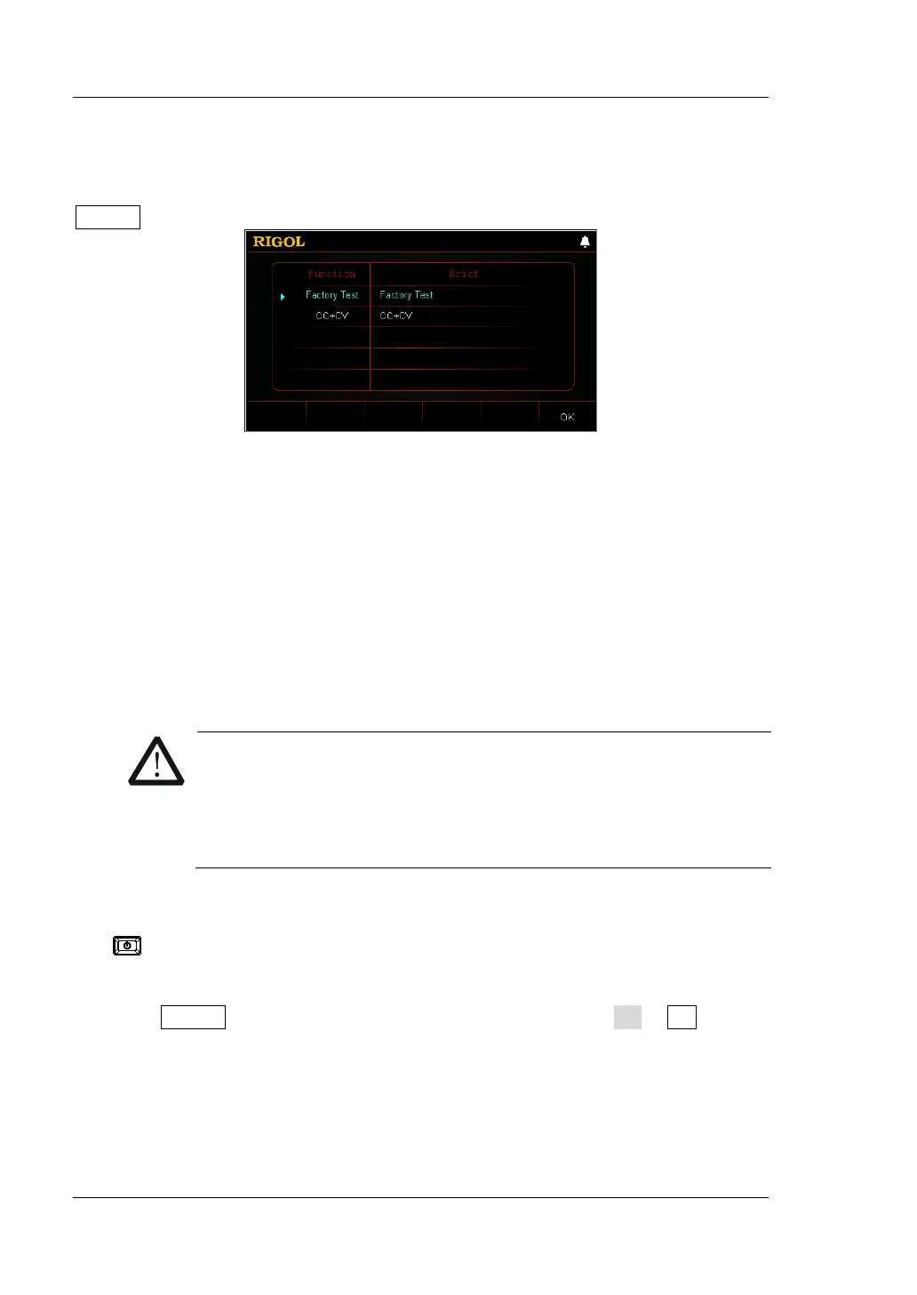 The advanced functions include factory test function and CC+CV function. Press