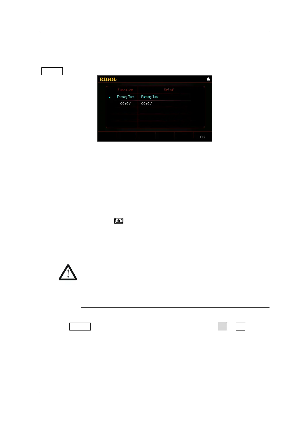 The advanced functions include factory test function and CC+CV function. Press
