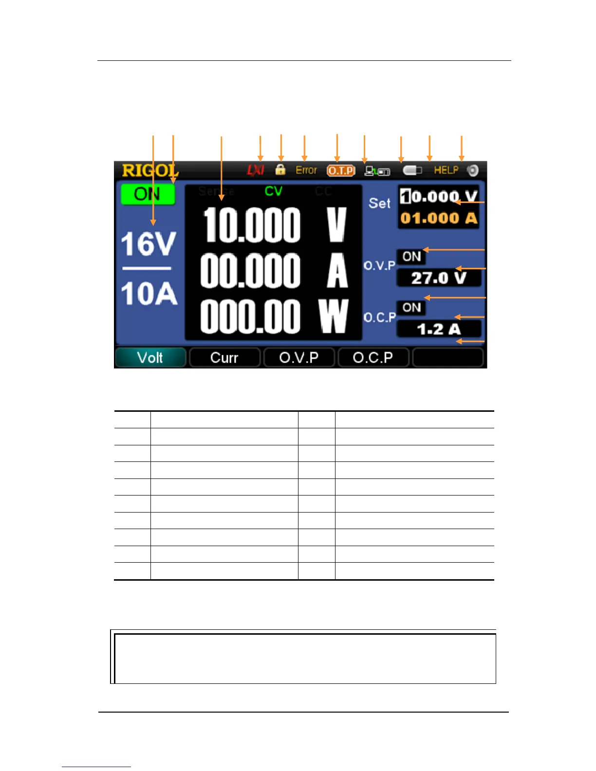 *Remark: This area displays the actual output values of voltage, current and power as well as