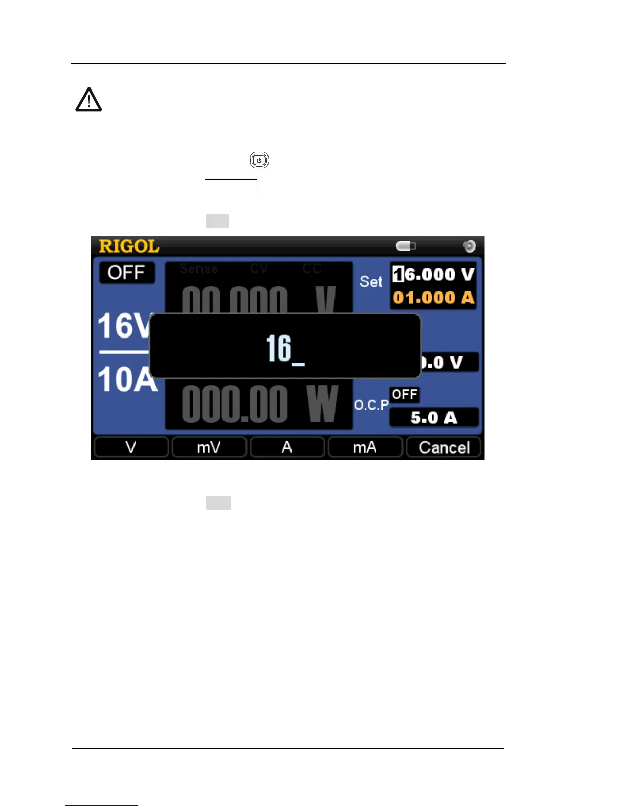 4. Voltage setting: press Volt and set the voltage to 16 V.