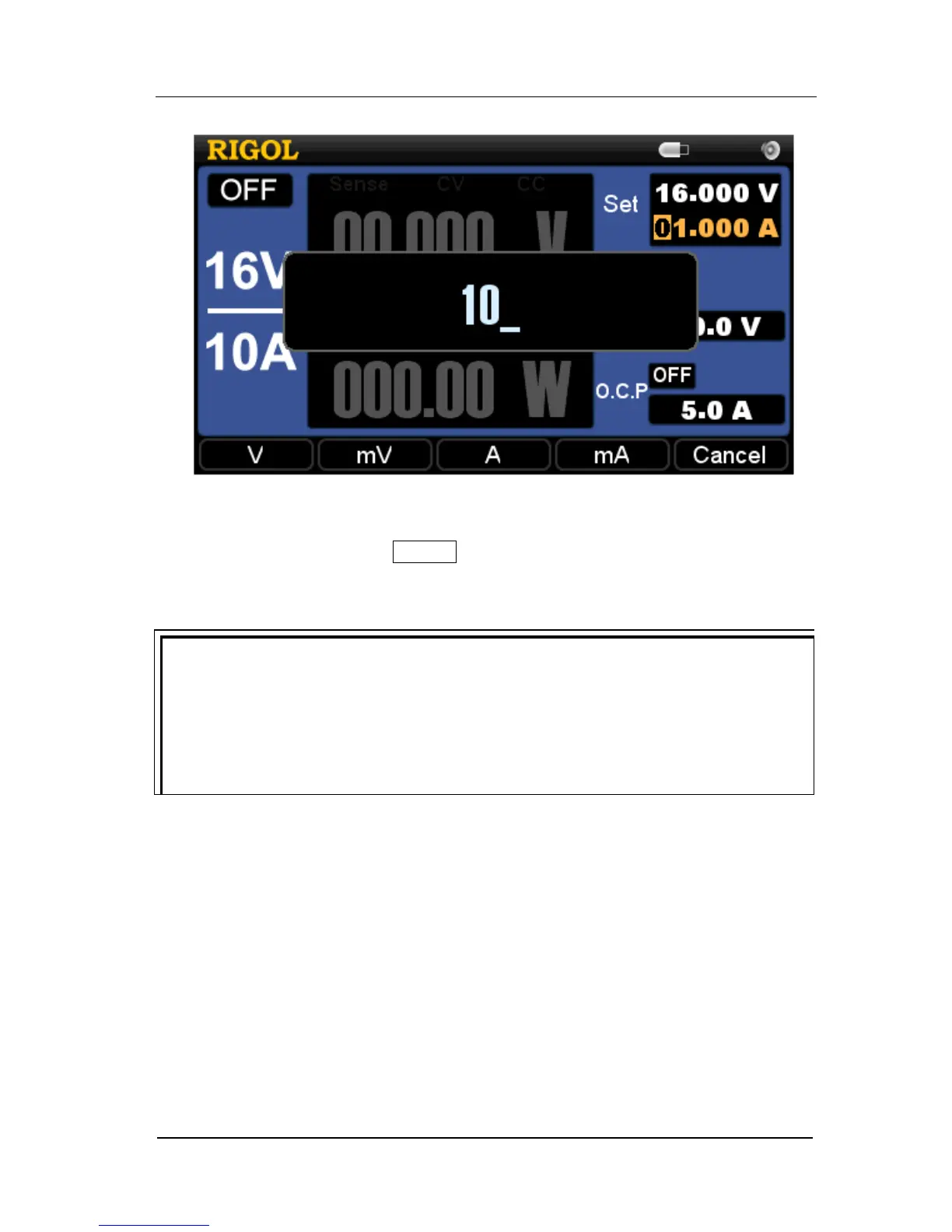 6. Turn on the output: press On/Off (the letter below this key On is highlighted)