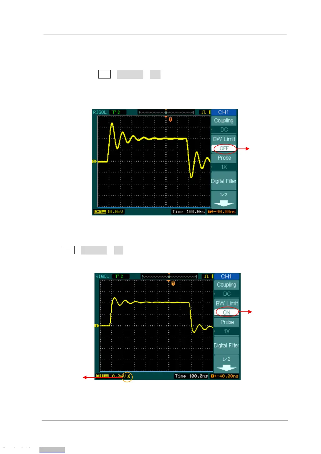 Press CH1→BW Limit→ON, to set up bandwidth limit to “ON” status. It will reject