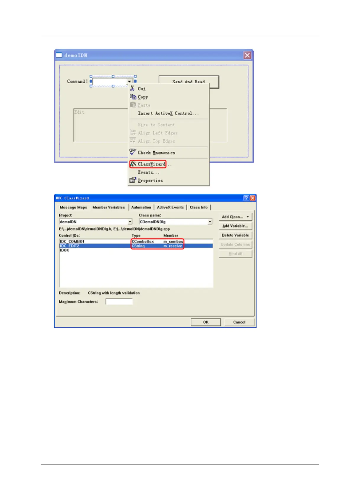 7.  Add the variables m_combox and m_receive for the Combo Box and Edit controls respectively.