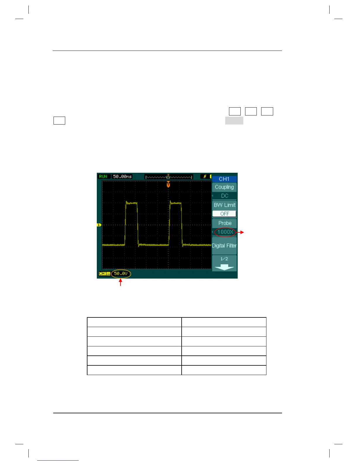 Figure 2-8 shows an example for using a 1000:1 probe and its attenuation factor.