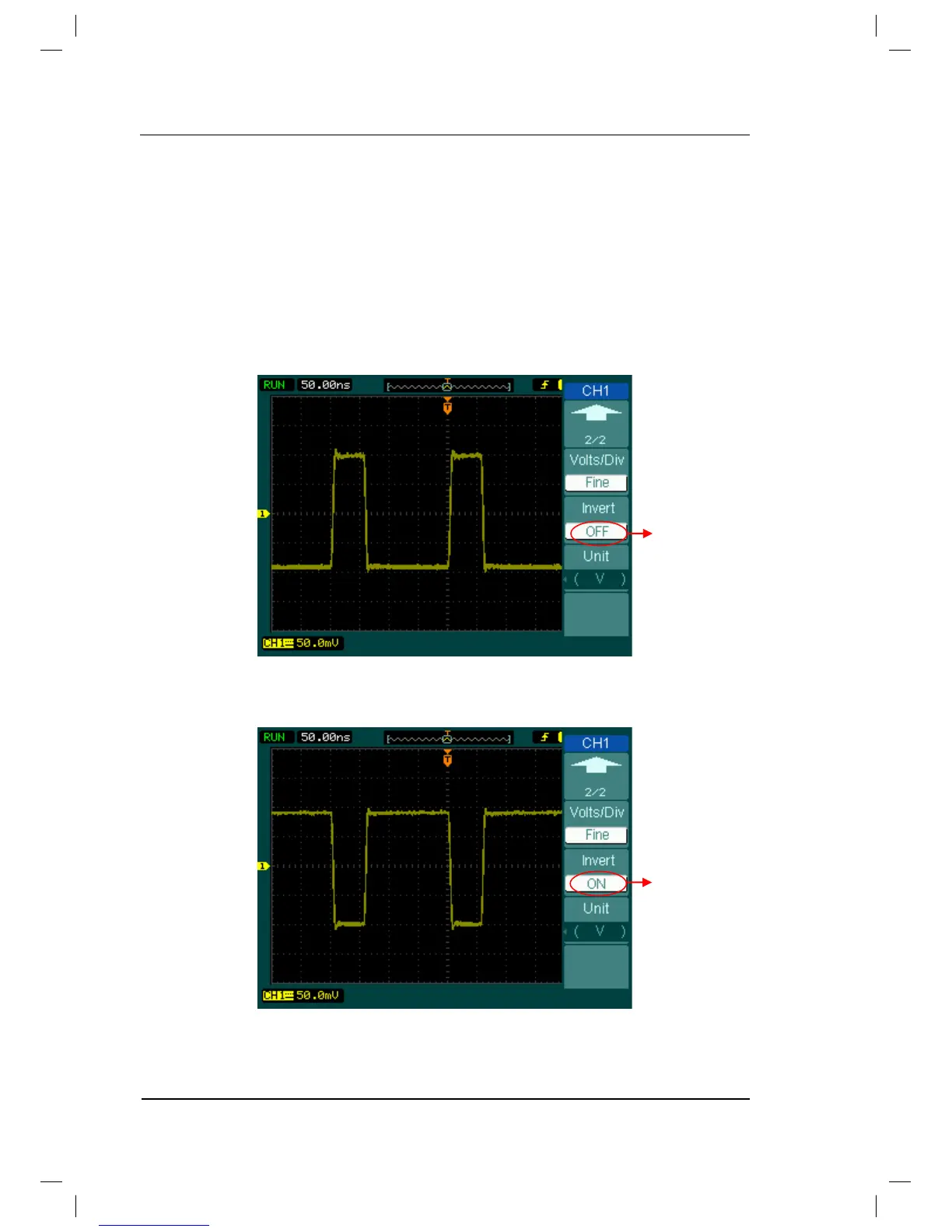 Invert turns the displayed waveform 180 degrees with respect to the ground level.