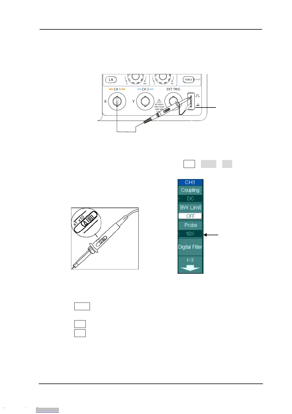 ② Set the probe attenuation to 10X. To do this, push CH1→Probe→10X.