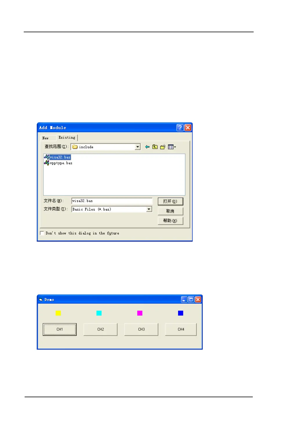 2. Choose Project→Add Module→Existing; find the “visa.bas” file in the