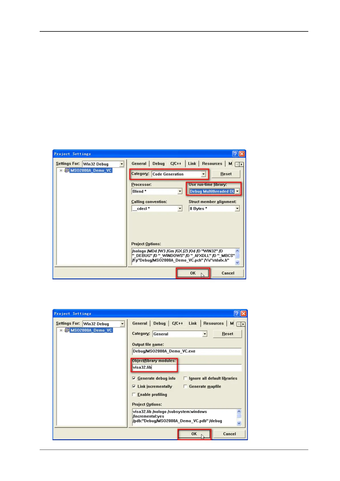 3. Open the Link tab in ProjectSettings and add visa32.lib to the Object/library modules