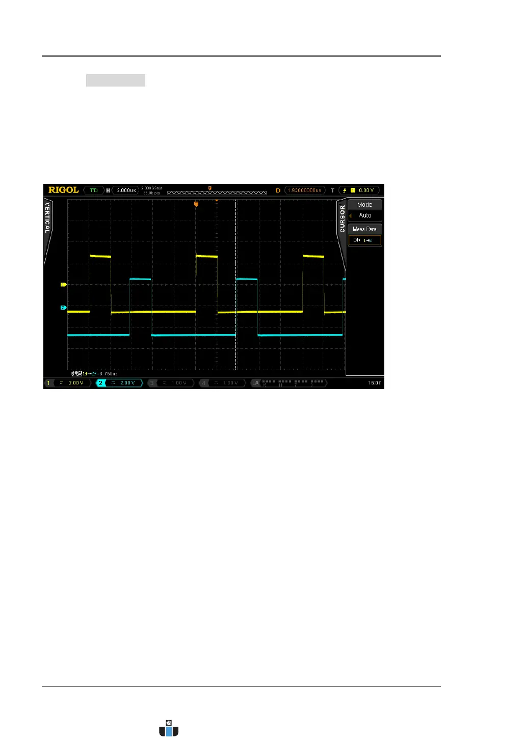 Measure the delay between the rising edges of CH1 and CH2 waveforms using Auto